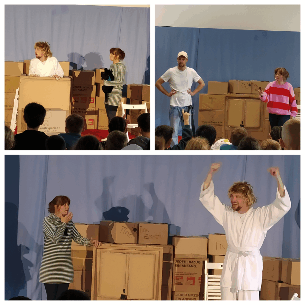 Am Montag, den 22.09.2025 war das lebensfrohe Präventionstheaterstück „Ganz schön blöd“ von Zartbitter e.V. zu Besuch in unserer Schule. Der Auftritt wurde komplett über die Bildungs-Stiftung der Kreissparkasse Köln finanziert. Das Stück wurde für die 3. und 4. Klassen aufgeführt und informiert die Schüler*innen über ihre persönlichen Rechte, spricht auf kindgerechte Weise das Thema sexuelle Übergriffe im Netz an und stärkt dabei die Widerstandskraft der Kinder. „Ganz schön blöd“ thematisiert den Unterschied zwischen „guten und schlechten Geheimnissen“ und ermutigt die Kinder sich bei Erwachsenen Hilfe zu holen, denn „Hilfe holen ist kein Petzen!“