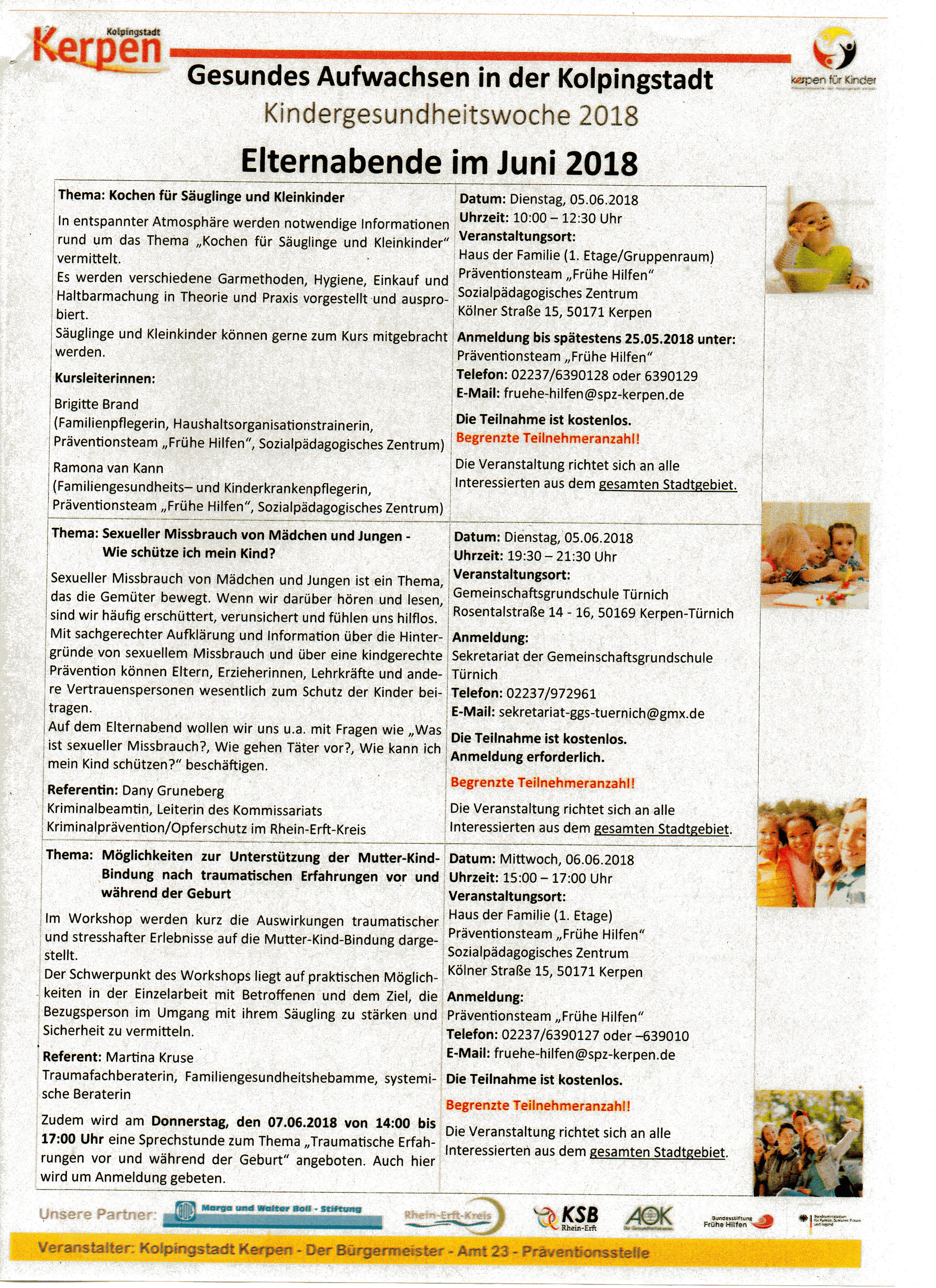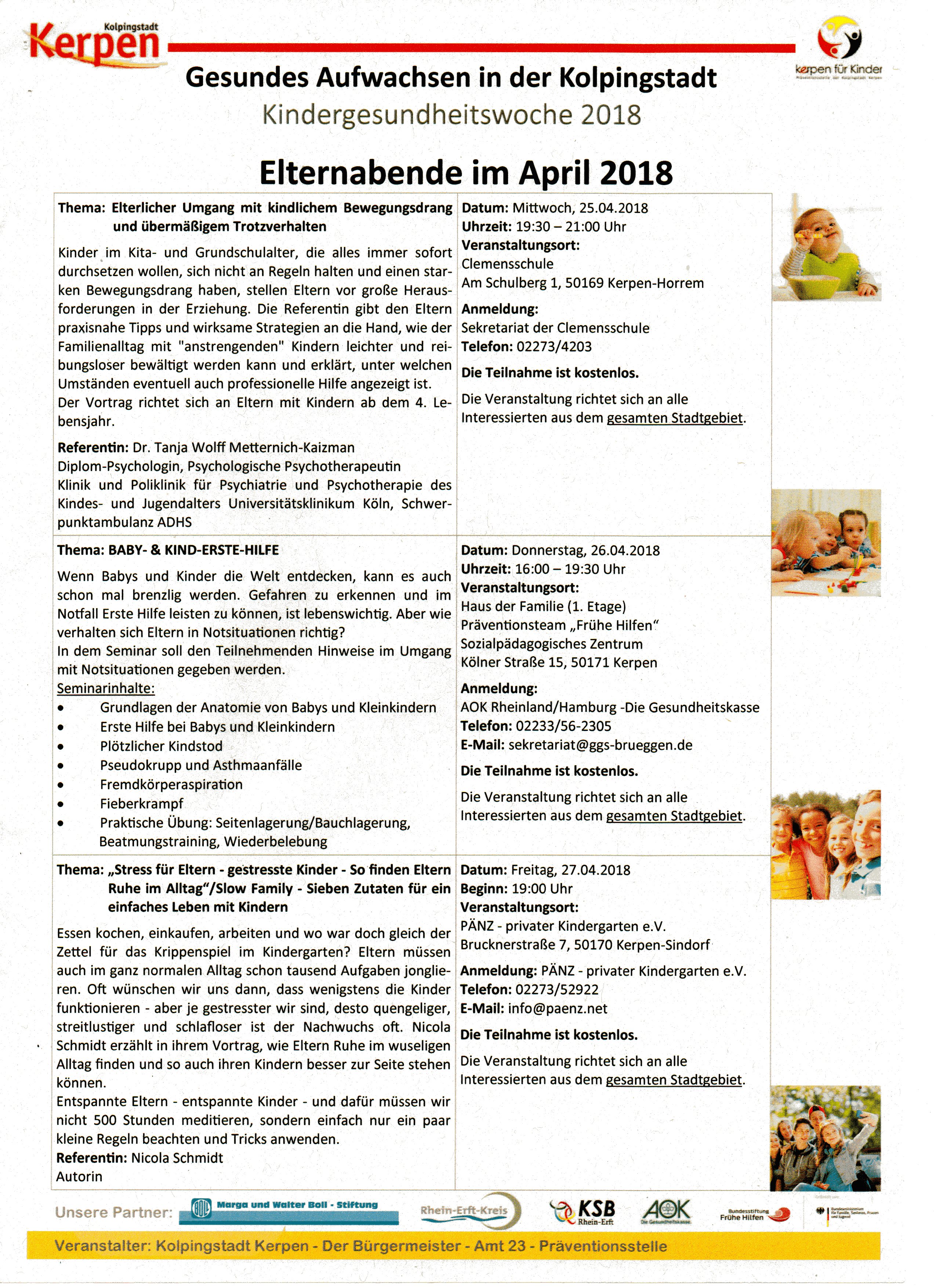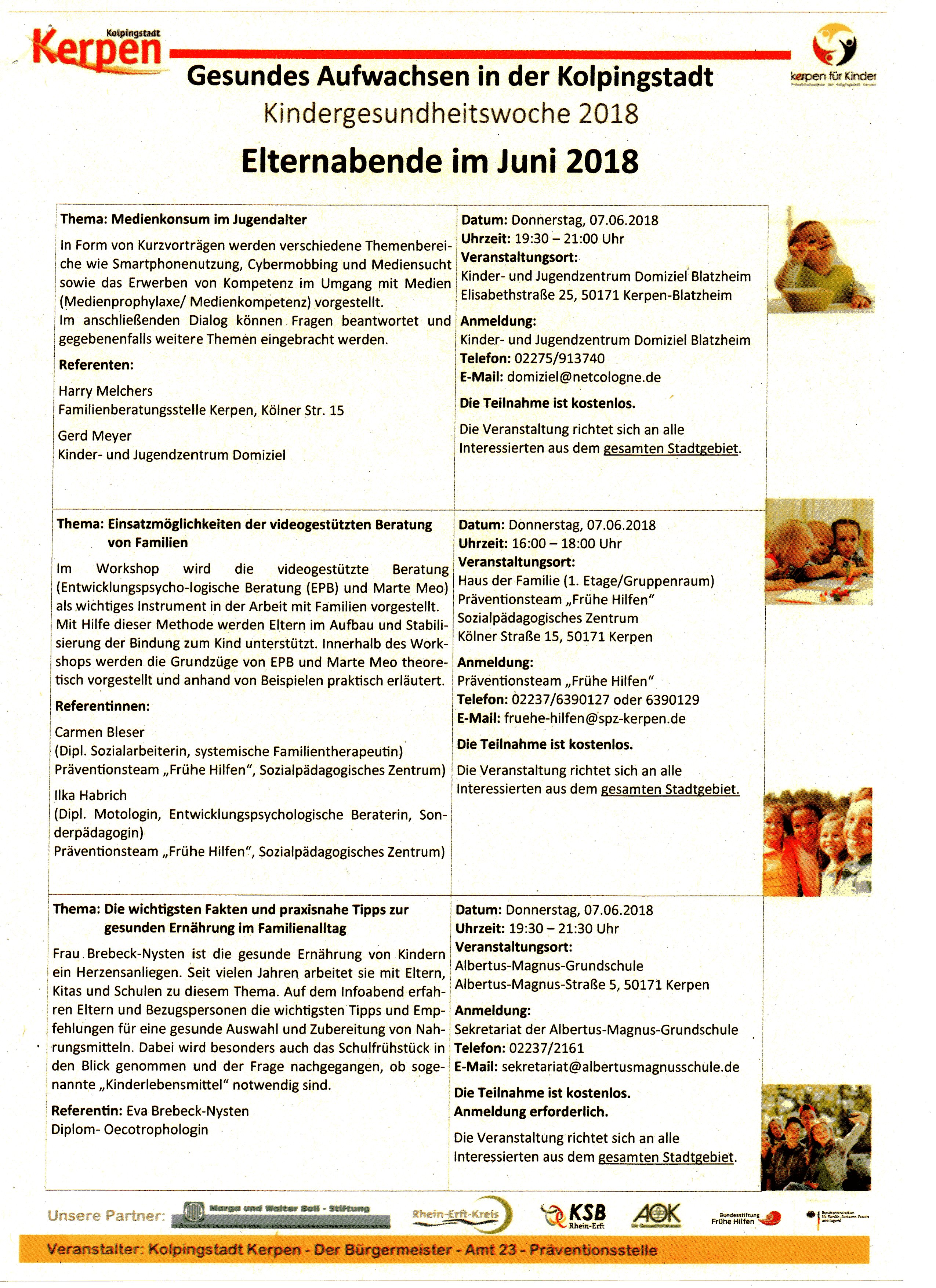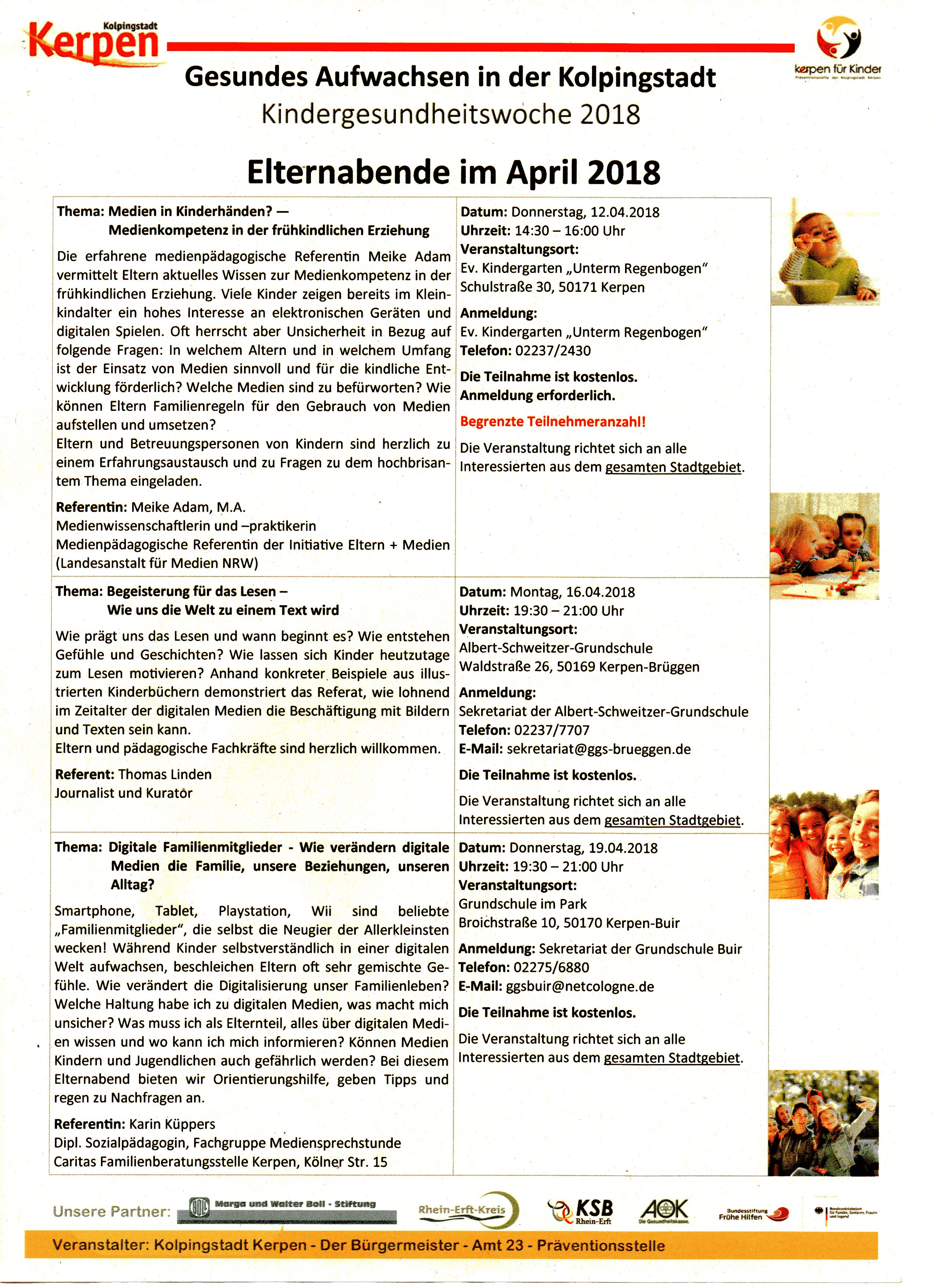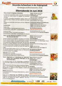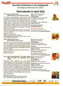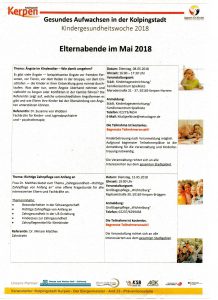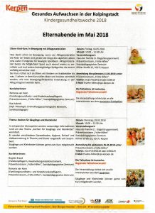 Kindergesundheitswoche 2018 – Gesundes Aufwachsen in der Kolpingstadt 18. April 2018Allgemeinschulleitung Im Rahmen der Kindergesundheitswoche 2018 bietet die Stadt Kerpen viele interessante und kostenfreie Elternabende an. Die Referent/innen freuen sich über eine rege Teilnahme. Nachfolgend finden Sie eine Übersicht über die Angebote: April Mai Juni
